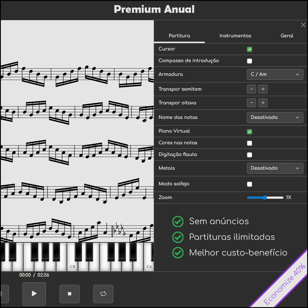 * No plano Free, pode ver 5 partituras por dia, ou até 10 ao ver anúncios.